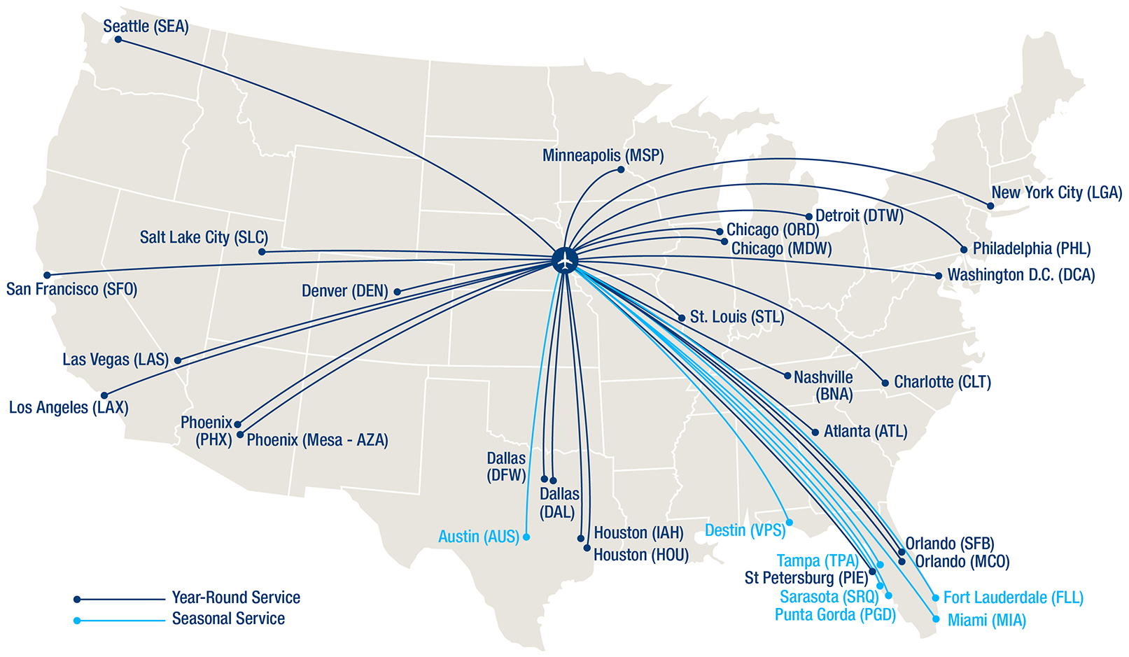 Salt Lake City (SLC) – Delta San Francisco (SFO) – United Sarasota (SRQ) – Allegiant (seasonal) Seattle (SEA) – Alaska St. Louis (STL) – Southwest St. Petersburg (PIE) – Allegiant