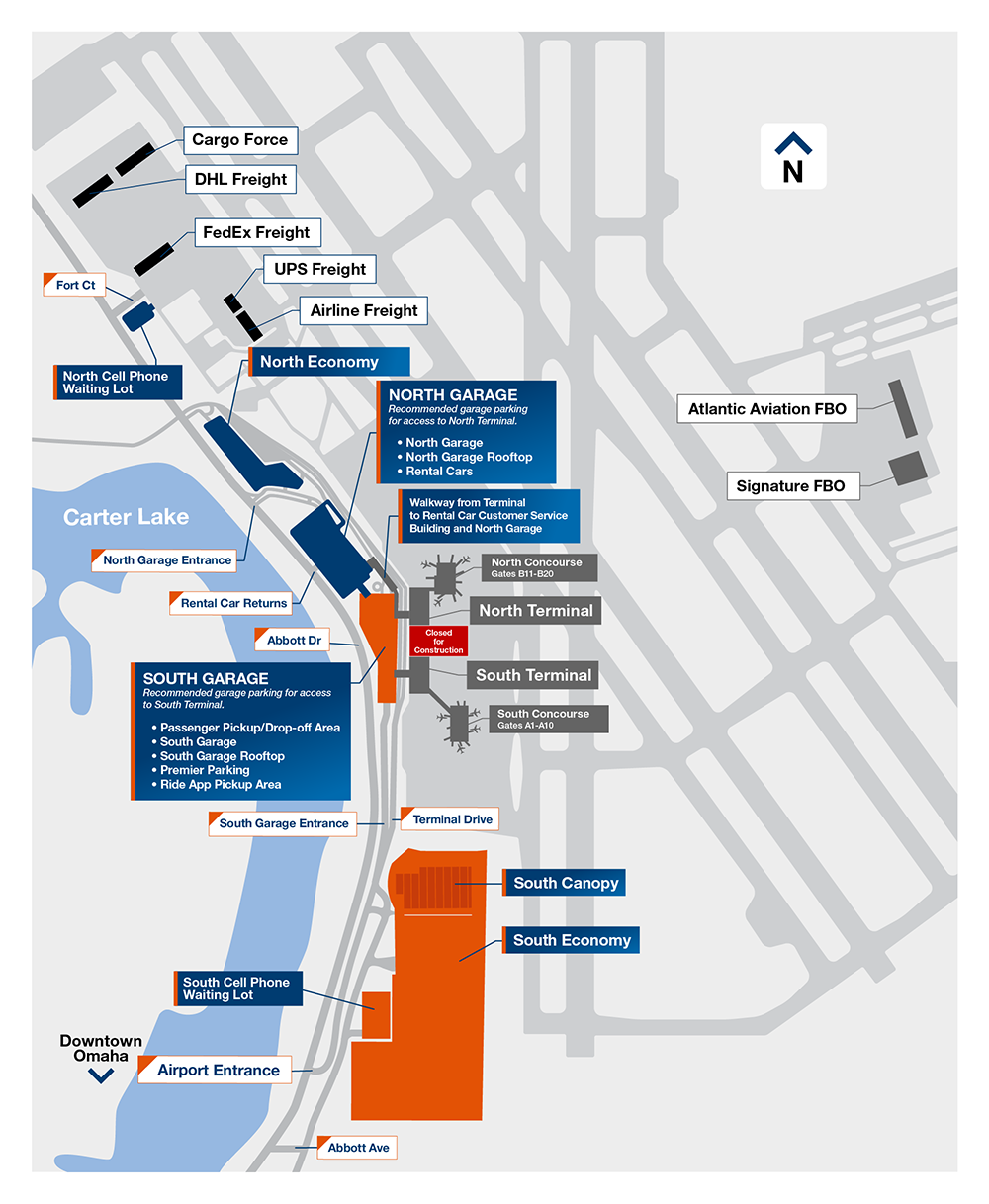 For a full list of ParkOMA’s parking options, including pricing, features, and real-time parking availability visit the Eppley Airfield parking page.